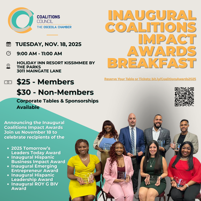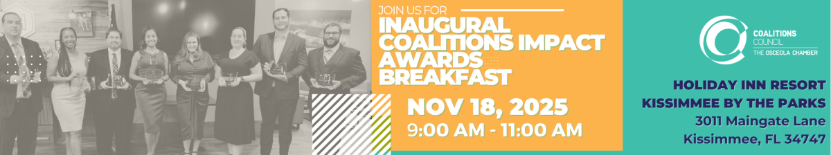 The Coalitions Council Board of Directors of The Osceola Chamber are pleased to announce that the 2025 recipients of the Tomorrow's Leaders Today Award, as well as the inaugural winners of four new awards, will be honored at a reception on November 18, 2025.